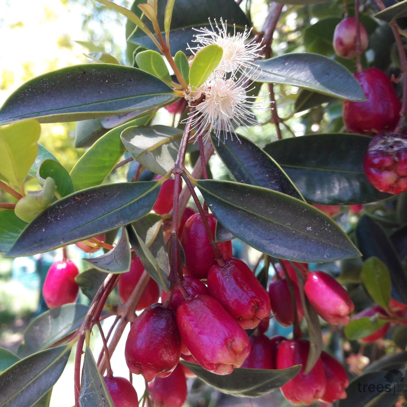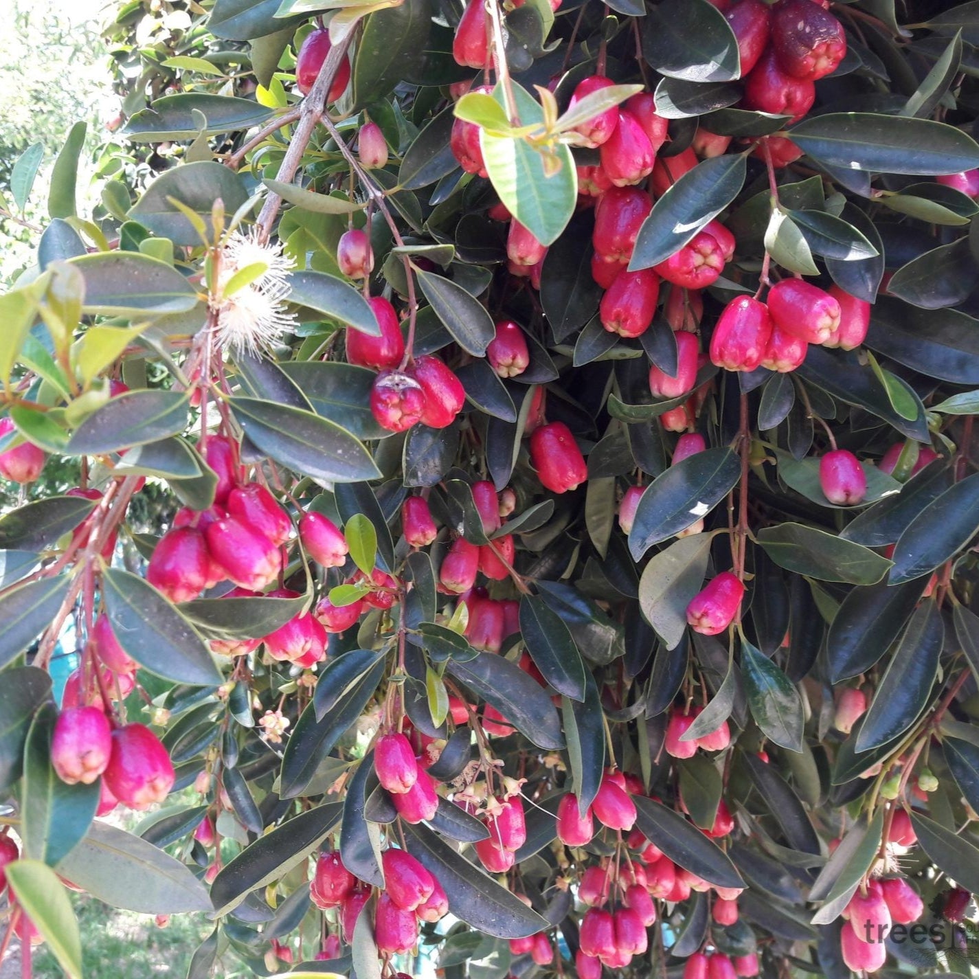 The Brush Cherry Tree or the magenta lilly pilly, also known as the Syzygium, is part of the Myrtle family and is found in South-East Asia, Australia and New Zealand. It produces petite white fluffy flowers during the spring and produces edible fruits in the form of bright red berries in the autumn. This bonsai tree also boasts dark green leaves which are of a pointy oval shape.